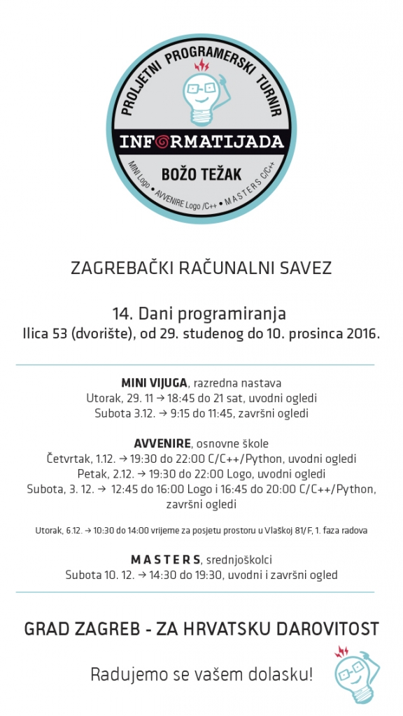 U ime Zagrebačkog računalnog saveza ugostila ih je udruga informatičara Božo Težak, na čelu s tajnikom udruge Kristijanom Burnikom, koji je uz osnovne informacije o radu s programerskim zanesenjacima, istaknuo da se u isto vrijeme, u središnjem prostoru u Ilici 53 pod vodstvom prekaljenog olimpijca Adriana Satje Kurdije održava i radionica za najbolje srednjoškolce, od kojih će mnogi i ove godine zakucati na vrata nacionalnog olimpijskog tima. Nismo zaboravili istaknuti da glavnu potporu za svoj rad ZRSovci imaju od Grada Zagreba, i da smo osobito ponosni na Nagradu Grada Zagreba i Medalju Grada Zagreba, oba najviša priznanja iz 2010. godine koja je ZRS dobio za svoj desetogodišnji rad i postignuća u poticanju darovitosti. No i ovom prigodom Kristijan je nesebično istaknuo kako je do kraja 1999. jedina udruga koja je iznimno snažno skrbila o darovitim informatičarima, bio samo HSIN – nacionalni savez informatičara. A nakon što smo mi ZRSovci krajem 1999. pokrenuli projekt ZA HRVATSKU DAROVITOST, i mi smo, u početku malo pomalo, a onda svake godine sve jače i jače, počeli davati i naš iznimno veliki doprinos nacionalnim programima u ime Grada Zagreba za što smo naposlijetku, kao jedina udruga dosad i zaslužili oba najviša priznanja Grada Zagreba.